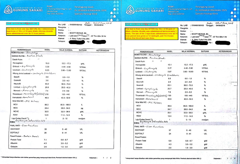 As you can see by the lab tests, ALL of my blood parameters were in the normal range, both before and after the three 10cc injections of 50ppm dilute CDH.