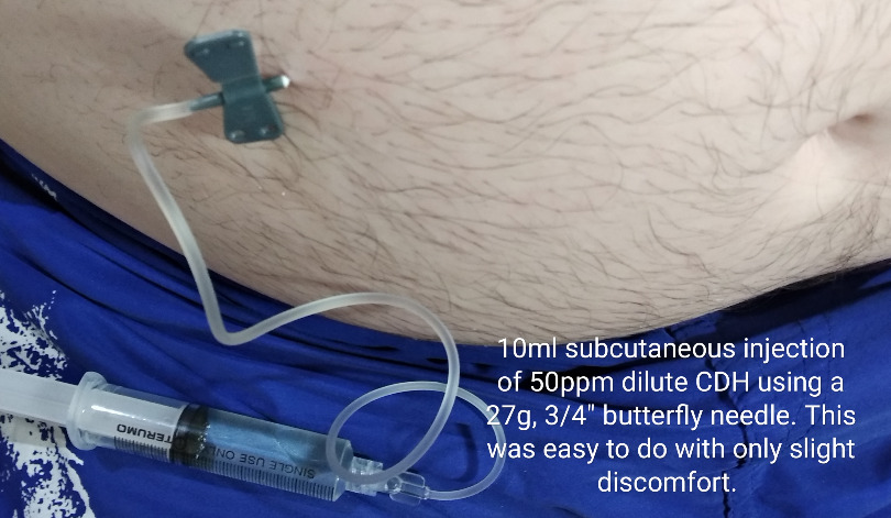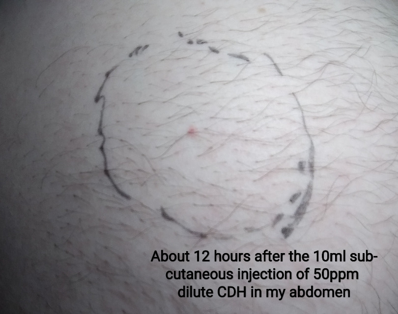 By the way, previously I had given myself multiple 12cc dilute CDH injections with various ppm concentrations, ranging from 87.5ppm to 150ppm for a cellulitis infection in my right leg. I was being treated in a hospital and was being given antibiotics but since nothing was working and I was getting worse, I decided to take matters into my own hands and give myself the CDH injections through the port in the IV that I was hooked up to. Hours after the first 12cc injection of 87.5ppm, done at about midnight (when nobody was looking), I literally saw definitely signs of improvement because my leg was much less red the following morning. I continued to improve and continued to experiment with the higher concentrations while I was there, taking advantage of the opportunity I was afforded via the IV.