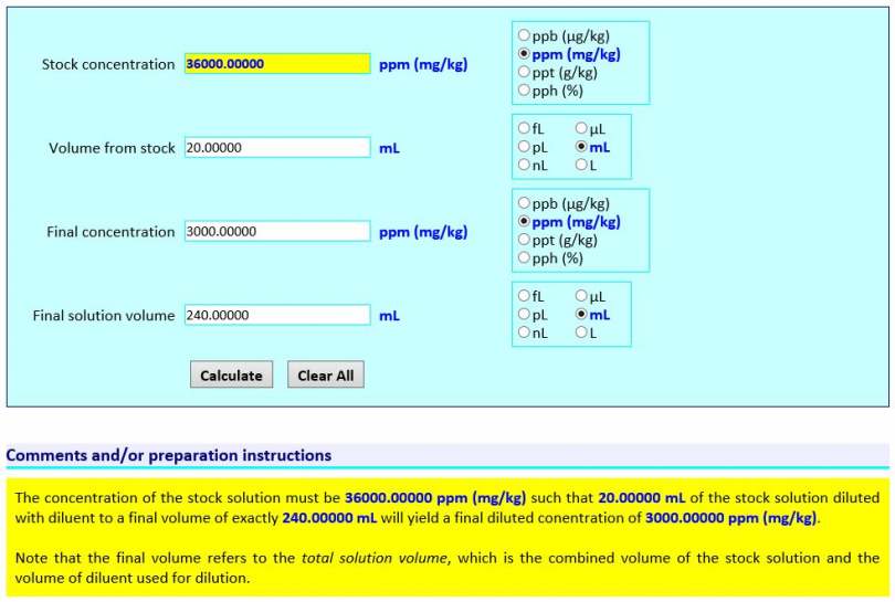 "The concentration of the stock solution must be 36000.00000 ppm (mg/kg) such that 20 mL of the stock solution diluted with diluent to a final volume of exactly 240 mL will yield a final diluted conentration of 3000 ppm (mg/kg).