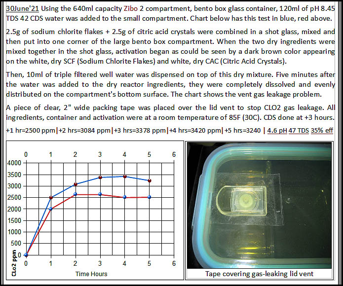 I take Andreas's point that it is important to keep the air space within the outer enclosure as small as possible so that the vapour pressure is as great as possible to facilitate the solution of the ClO₂ gas into the receiving water. If I were using the two-chamber container that you show, I would be putting the water in the larger container and the reagents in the smaller one so as to 1) maximise the amount of CDS processed each time and 2) reduce the air space inside the container so as to speed up the transfer of the ClO₂ gas and reduce the amount of ClO₂ that remains as gas and is lost inevitably.