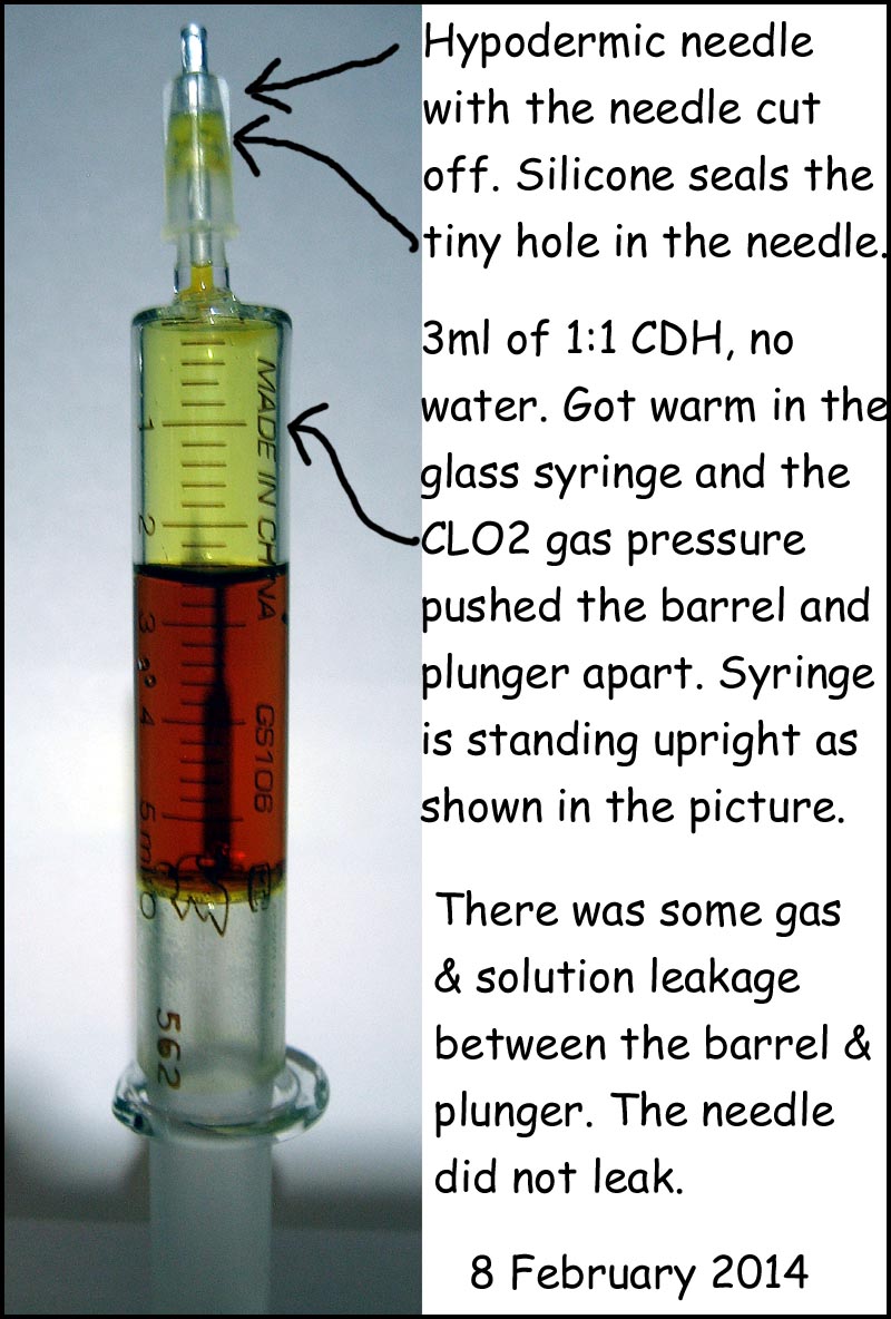 During the 1 minute activation in the 3ml syringe, there was not enough gas pressure to push the syringe plunger any measurable distance. So, there was no CLO2 gas escaping during activation; it all went into the solution.