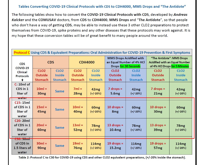 Here's a table I made which compares the milligrams of CLO2 between Protocol C - C30 for COVID-19 and CDH4000, MMS Drops & The Antidote. MMS Drops & The Antidote both use MMS Drops which have been partially acidified outside the body and then are ingested. Protocol-1 uses these same drops but just allow the stomach acid to do everything internally. Notice how just 13 drops a day provides more mgs of CLO2 than C20 provides. And C20 is considered as a prevention for 1st Responders of COVID-19.