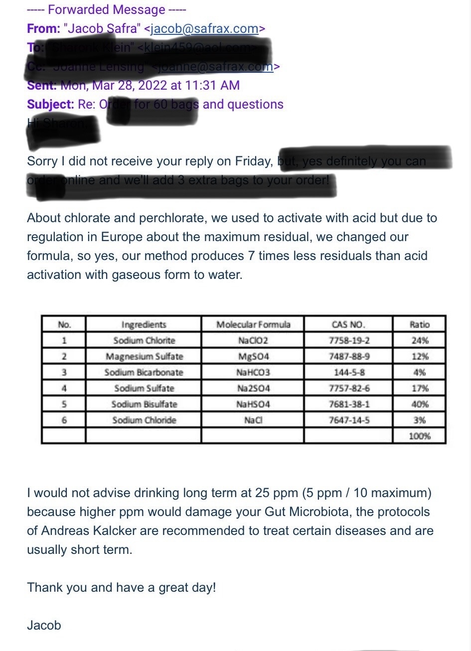 A couple of years ago, my sister wrote to Safrax and asked them about their CDS tablet ingredients. She uses the tablets for her hot tub and other uses. Here’s what Jacob responded. The chart shows the ingredients they were using at that time.