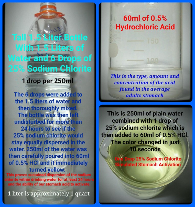 -2. One drop put into 250ml of water and then combined with 60ml of 0.5% HCl (what the average person is supposed to have in his/her stomach) will basically completely activate (probably 90 to 95% activate) the drop. So assuming that it produces even 6mg of CLO2 of the 6.7mg available per drop (24 drops per ml), then you'd have 310ml of 19.35ppm of CLO2 - And this is for JUST 1 DROP! To put how much CLO2 this is into perspective, water treatment professionals use just 2ppm to decontaminate very dirty water in water treatment plants. So this 1 drop will produce about 10 times more CLO2 then that in those 310ml of water.