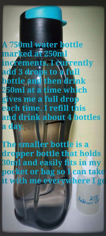 Here's the bottle I use to drink out of - it's 750ml, and the 30ml dropper bottle I use to dispense the drops with and carry outside the home. (I actually use 25% sodium chlorite since that's the way it comes here - it's just a bit more concentrated than MMS, which is 22.4% sodium chlorite)
