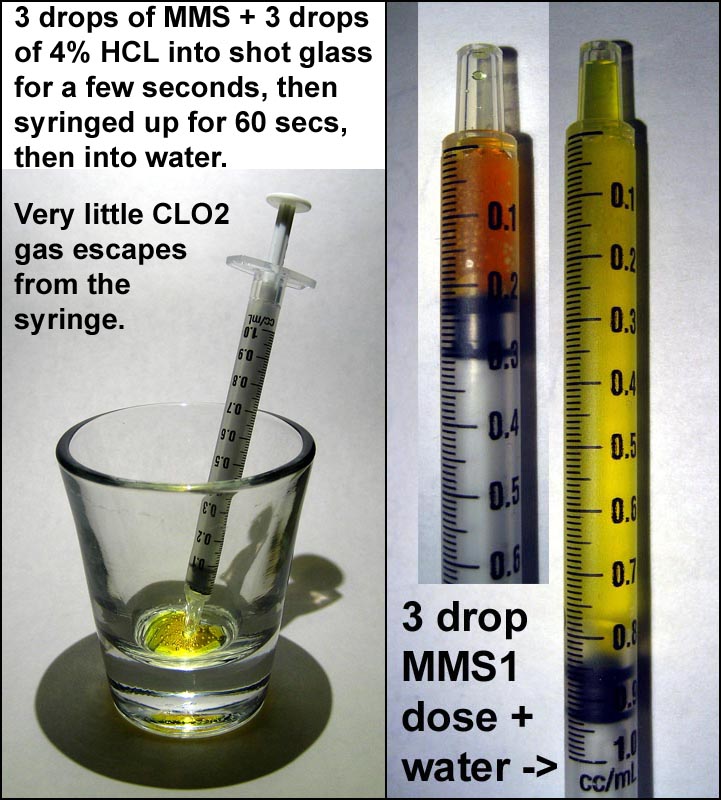 Here is another simple method to make a 3 drop dose of MMS1 without releasing any, or at least hardly any, chlorine dioxide gas into the room, so you won't smell an aroma.