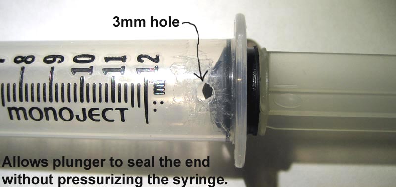 Note the small hole drilled near the plunger end. That hole allows the plunger to be inserted just enough to seal the syringe chamber, but not pressurize it.