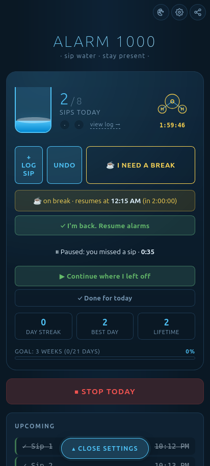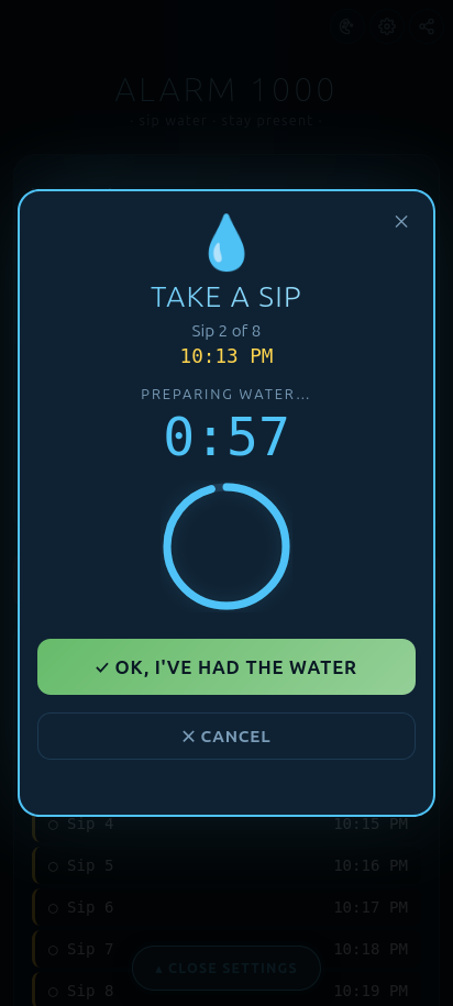 Forget complicated apps, subscriptions, and endless notifications. Alarm1000 is a clean, open-source hydration reminder that does one thing perfectly: it helps you drink water regularly.