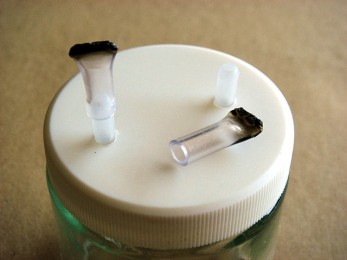 I drilled a couple of small holes in the lid that were slightly smaller than the plastic tube joiners and forced the joiners in, to make a gas-tight fit. The pressure is very low of course, so we don't need to get highly technical here. Glueing these in place is a good idea for protracted usage.