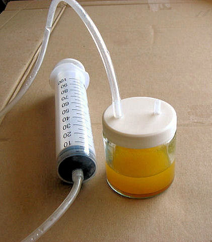 The 100Ml syringe can be attached with a piece of tubing to the other joiner.