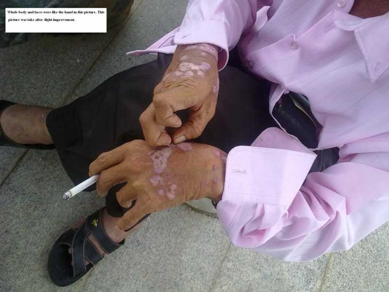 Yes, this person had it in whole body including faces... imagine how hard he was trying to get a job with a skin diseases like that and it was not able be healed for so long... MMS1 was not only save his health.. but give him back some working life... When you see clearly on the picture.. his leg also have it... is a whole body skin diseases with no drugs could ever improved what MMS1 could improved.