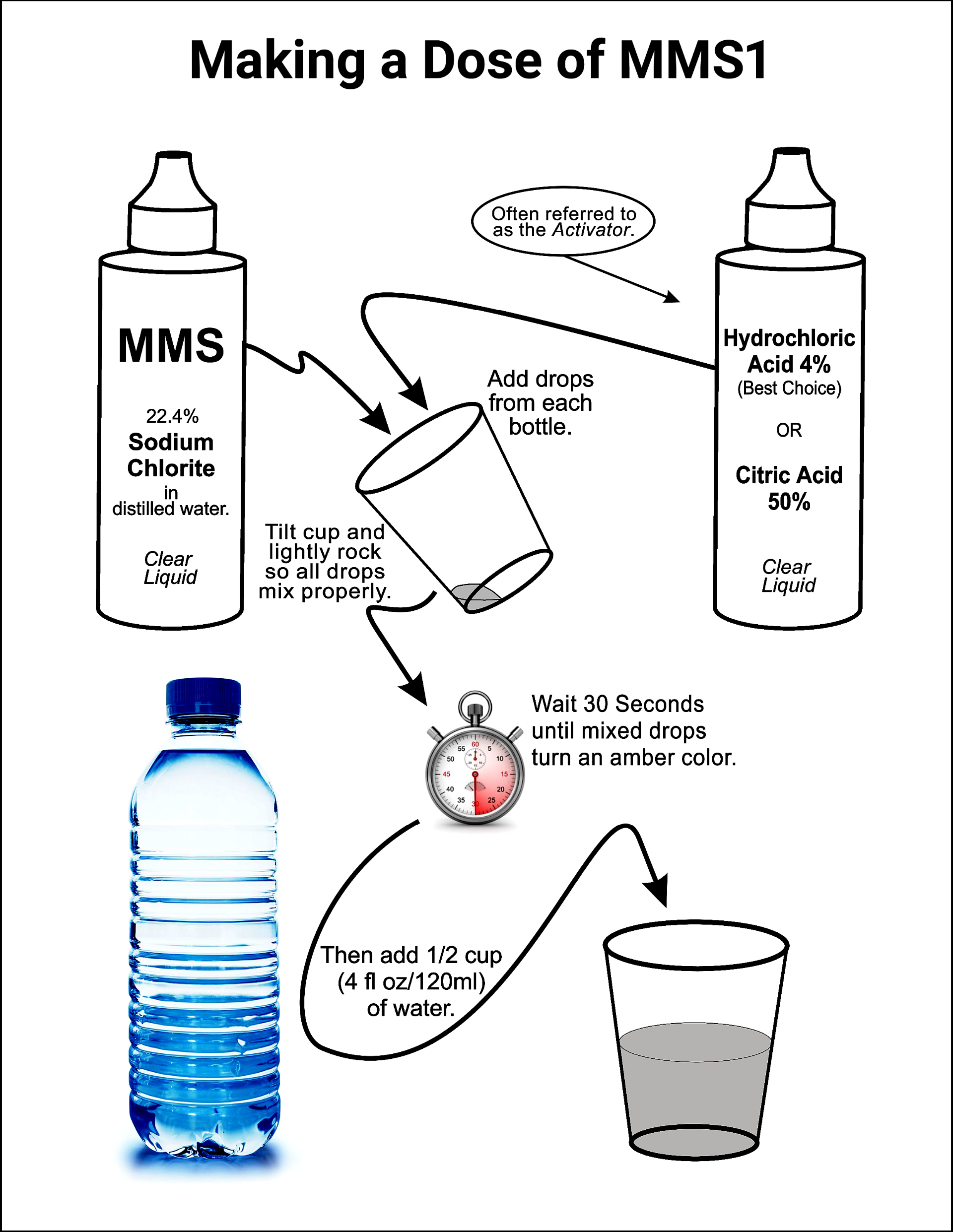 The drops of SCS and CAS must first be combined without added water. After 30 seconds of activation, then water is added. Now you have one dose of MMS1.