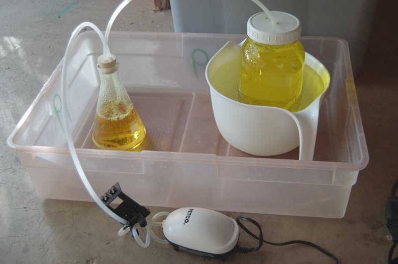 I had 1000 ml of cold distilled water in the 1/2 gal. mason jar and used 110 ml of MMS and 110 ml of HCl 4%. I let the air pump for 30-40 mins. till the chambers were both the exact same yellow color.
