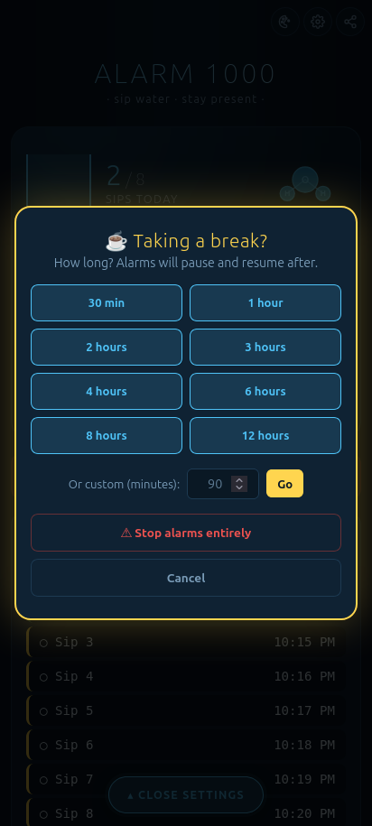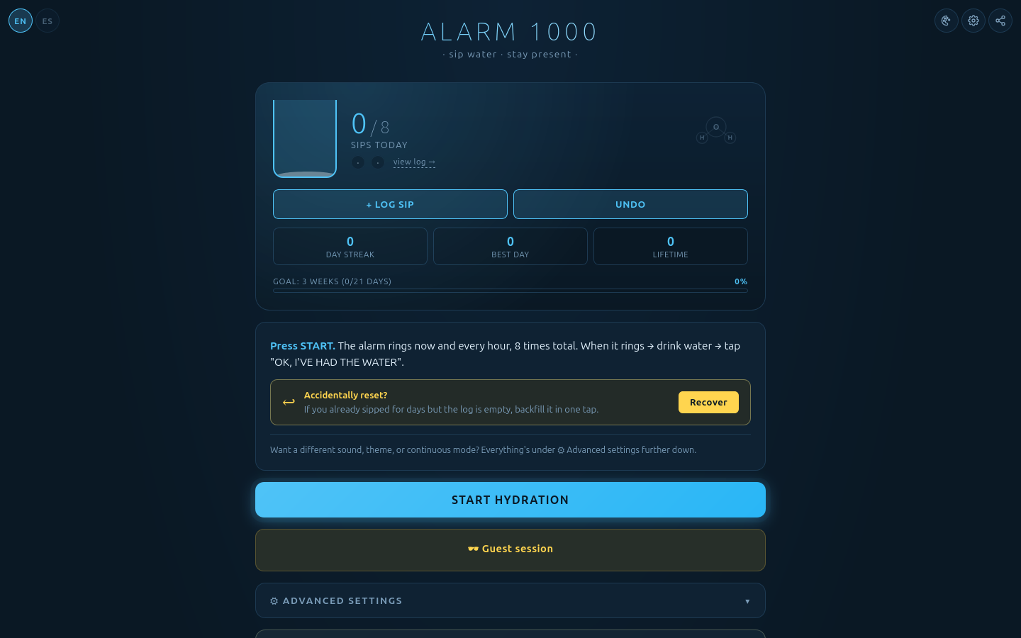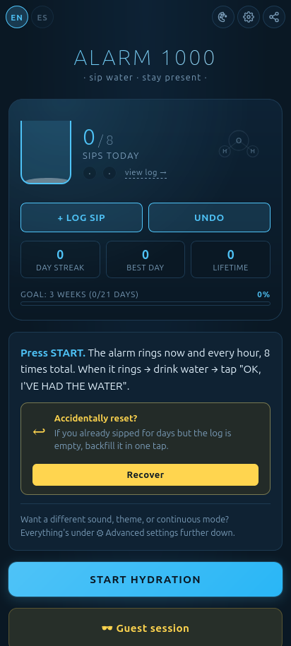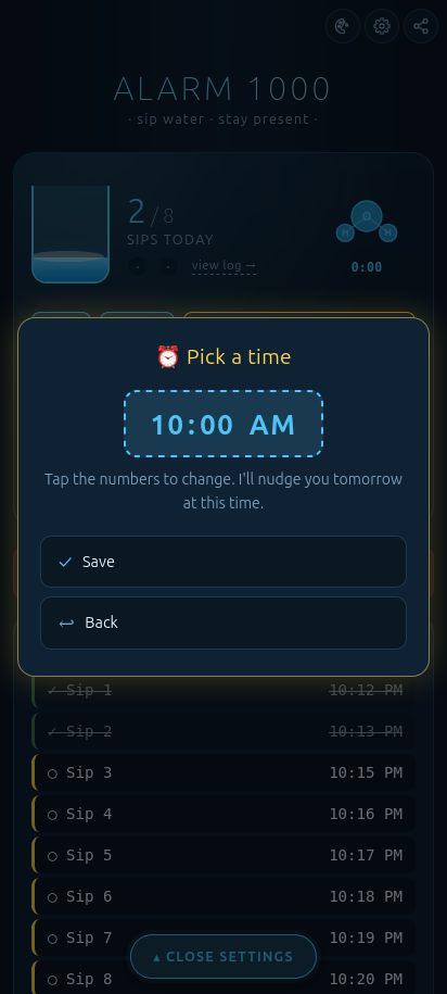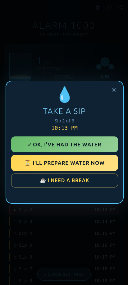 Forget complicated apps, subscriptions, and endless notifications. Alarm1000 is a clean, open-source hydration reminder that does one thing perfectly: it helps you drink water regularly.