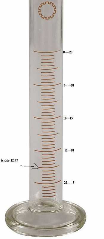 I just looked at my cylinder and it has mire lines to lead to 15..from 10 it has5 small lines then a dark line then 5 small lines then dark line with 15 next to it ..so where would 12.5 be on that then same? im confused. I cant take a pic of mine my camera is messed up. I took that off the internet and used paint can someone take a pic for me and show me where 12.5 is on a 25ml cylinder?